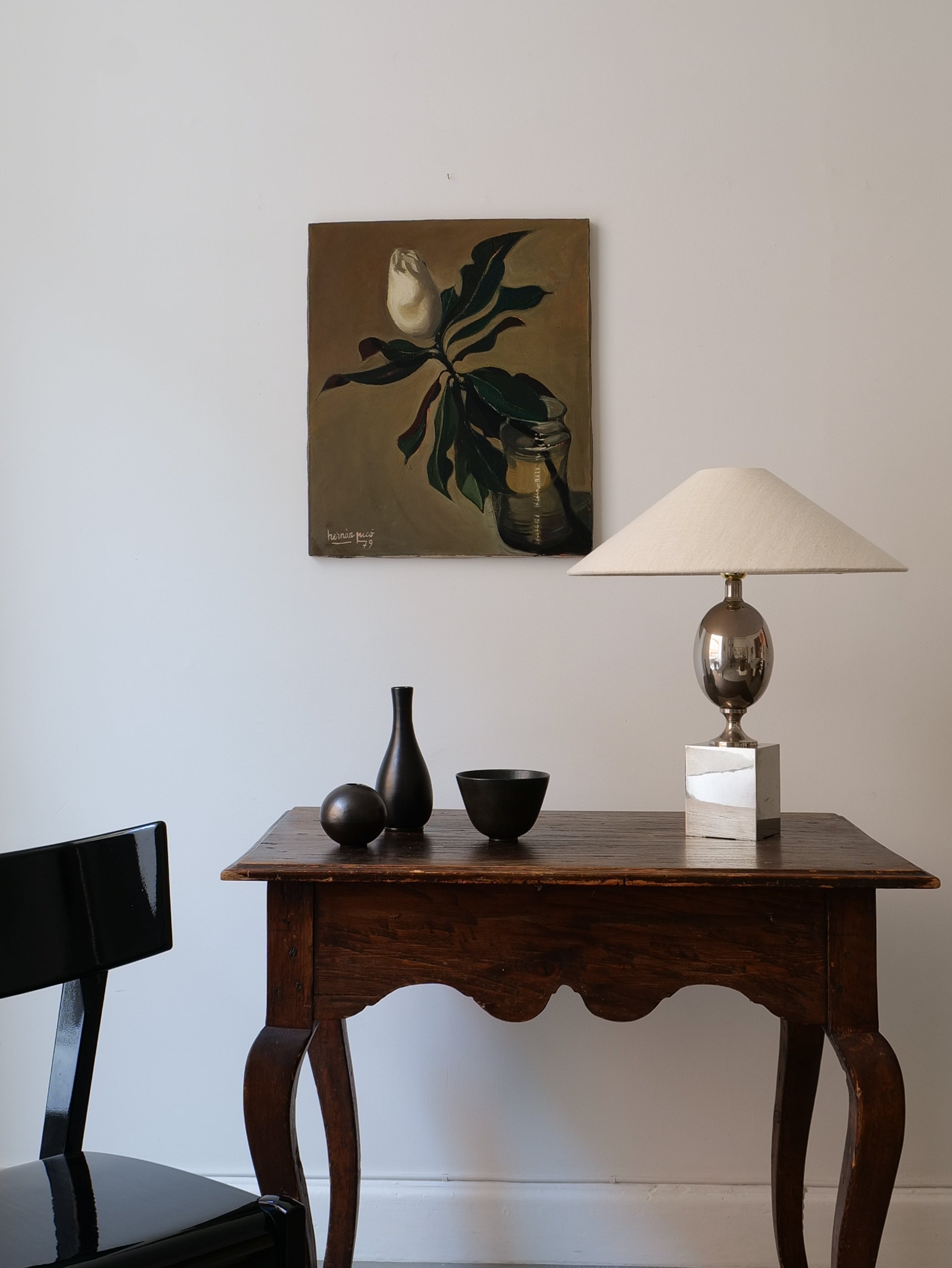Bringing the Spring indoors with this striking still life of a Magnolia stem about to bloom.  There is a wonderful depth of colour to this oil on canvas with strong and confident brushstrokes building up to a sumptuous colour palette.