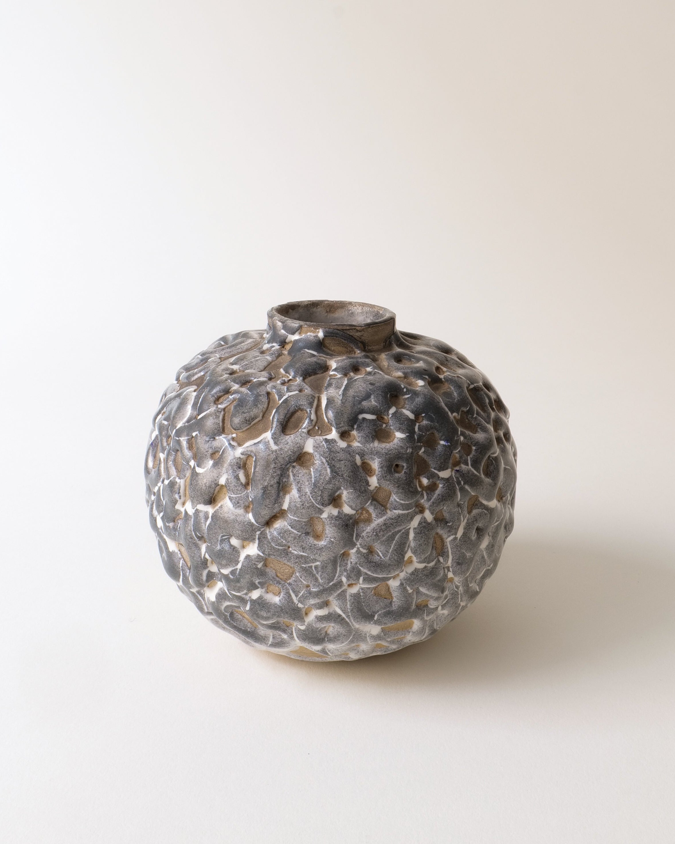 A tactile stem ceramic vase designed by Alfred Renoleau for l'Atelier La Charentaise Angoulême, France. Stoneware ceramic with a crisp enamel glaze finish in grey and white.