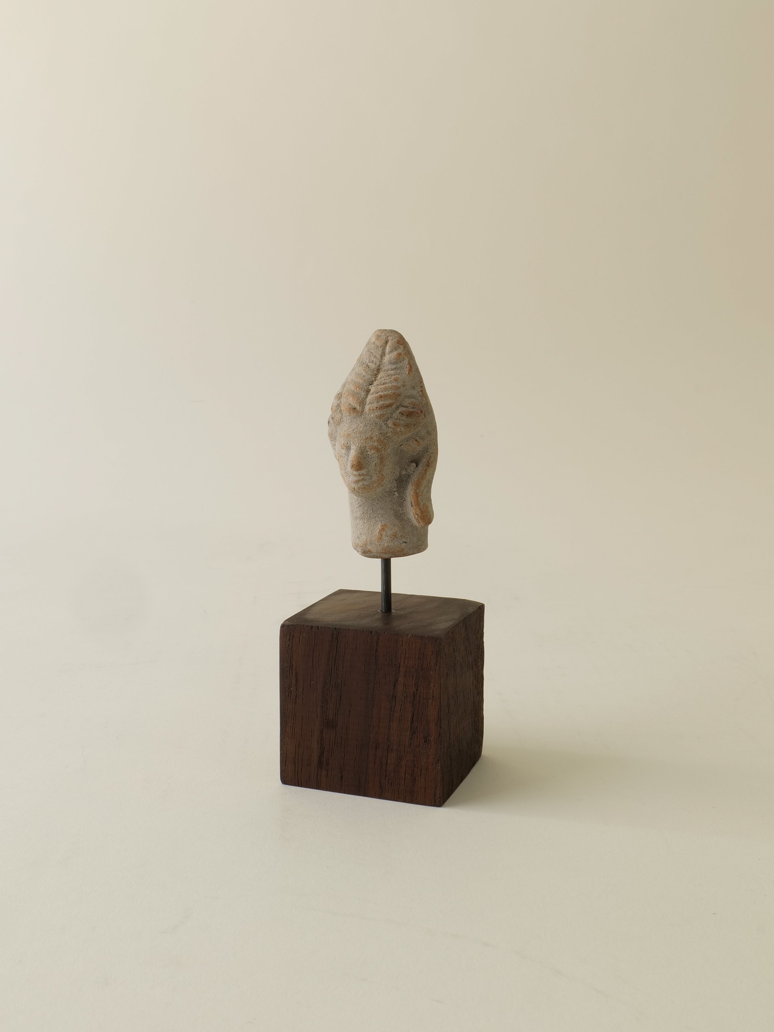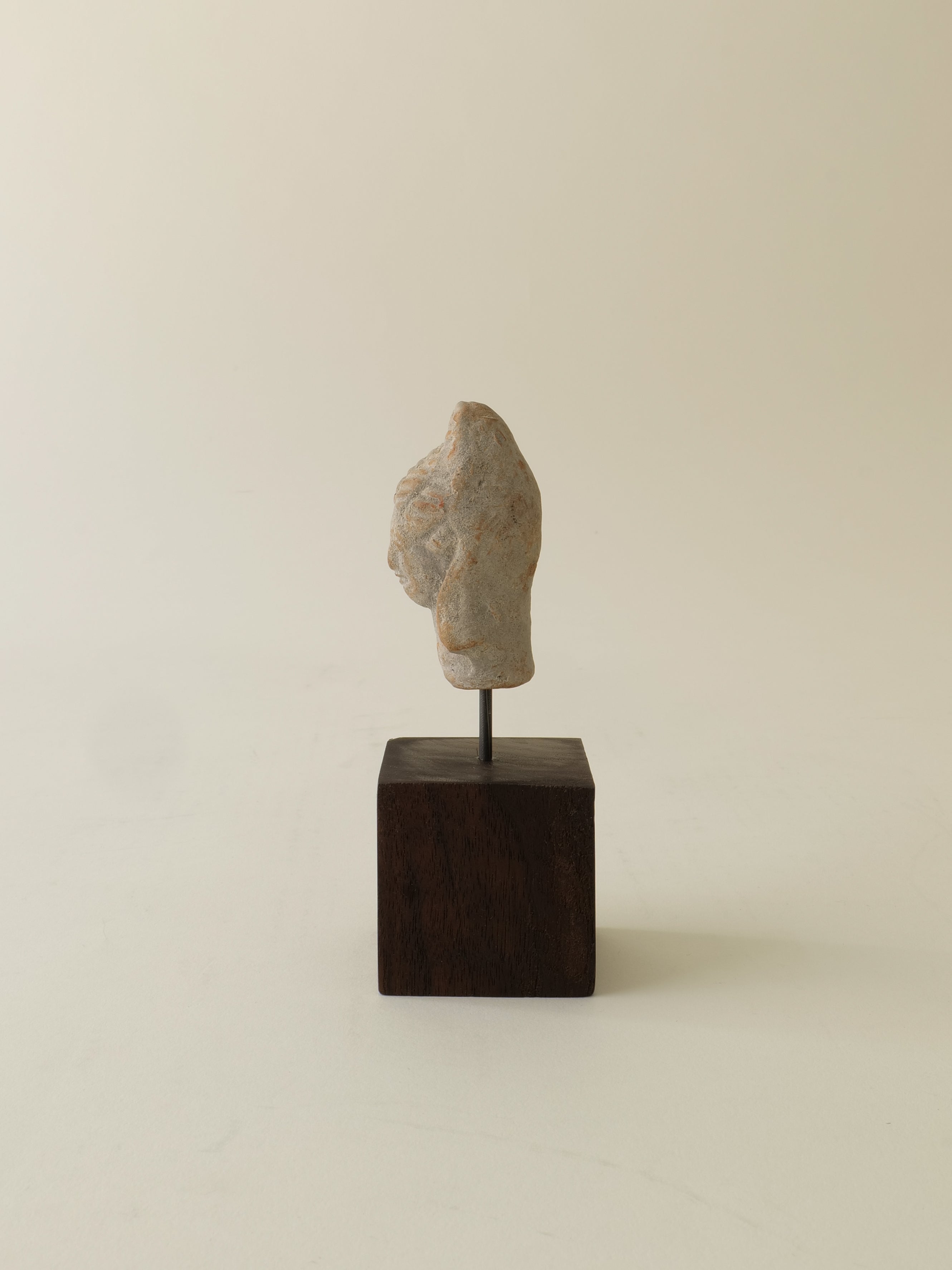 An ancient sculpture of the Greek Goddess Hera, made of sandstone, mounted on a walnut wood pedestal.