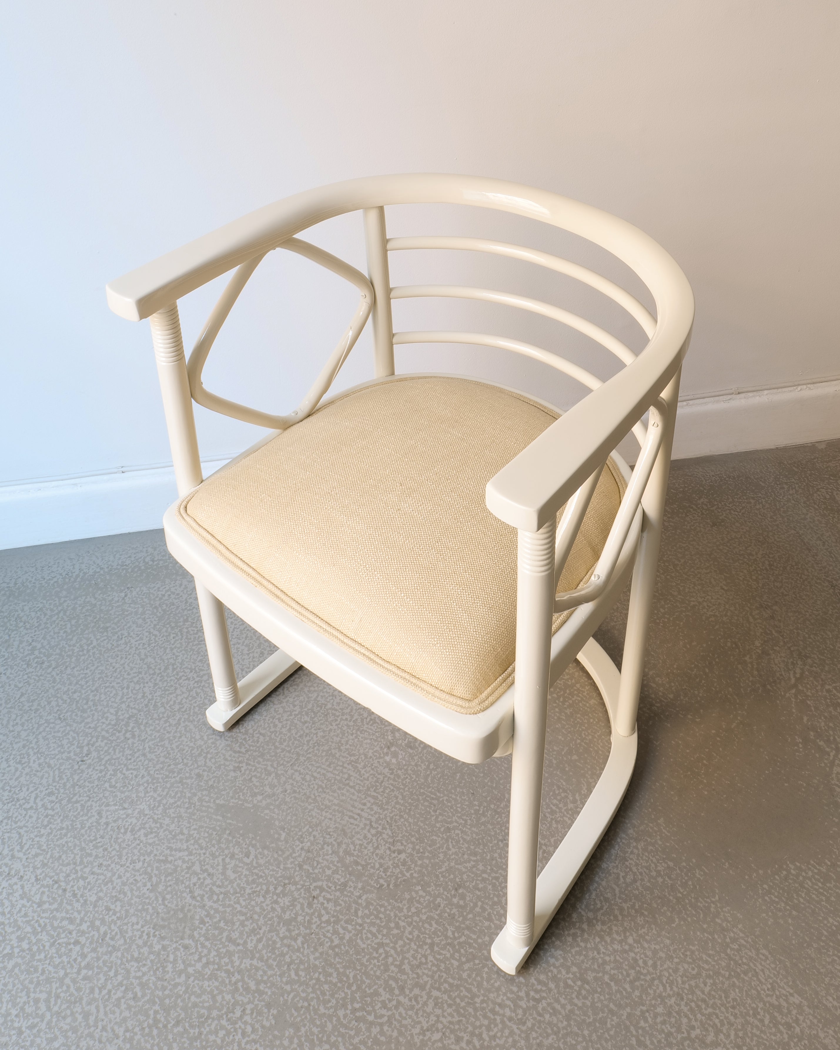 RESERVED: A pair of bentwood armchairs designed by Austrian architect Josef Hoffmann and manufactured by J&J Kohn in 1905. The horseshoe construction features distinctive oval details that create visual lightness, characteristic of Hoffmann's Viennese Secession aesthetic. Fully renovated in a high-gloss buttery cream lacquer and reupholstered in textural linen by Dedar Milano. Original manufacturer's stamp present. Sold as pair.